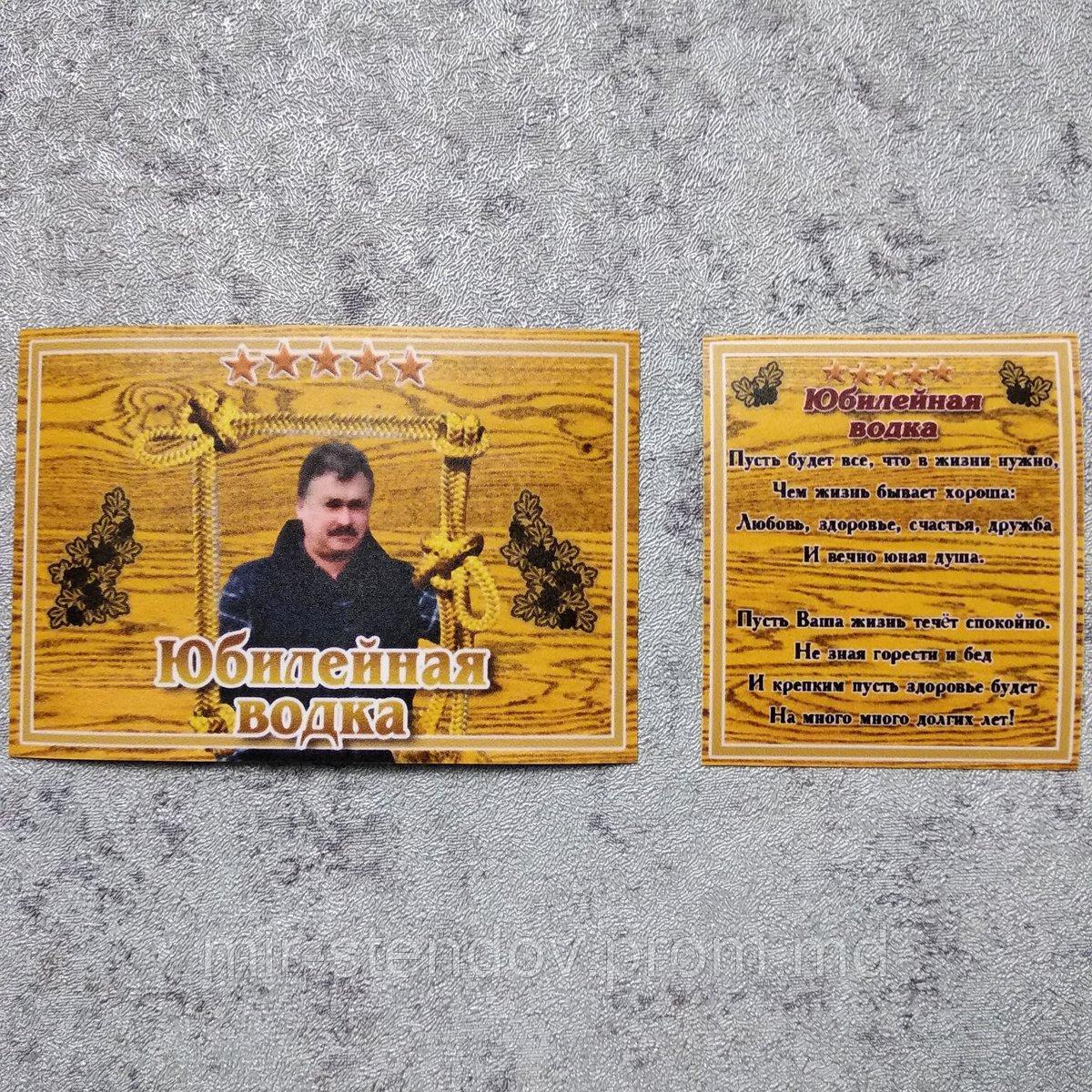 Оригинальный подарок юбиляру. Бутылка водки с индивидуальными этикетками, на которых изображен виновник торжества. Кроме того, на контр-этикетке мы можем разместить Ваши личные пожелания, стихи, тост для виновника торжества.